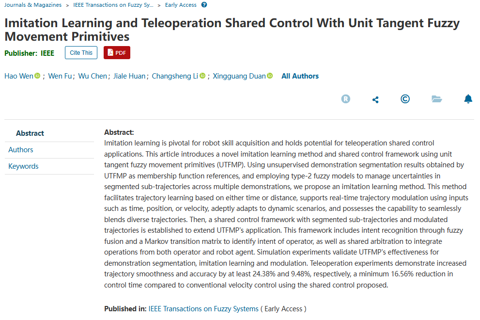 近日,万象城体育在线官网(中国)有限公司许段星光教授科研团队在机器人技能学习及共享控制领域取得新进展,研究成果以“lmitation Learning and Teleoperation Shared Control With Unit Tangent Fuzzy Movement Primitives”为题发表在模糊学领域的国际顶级期刊《IEEE Transactions on Fuzzy Systems》(IEEE TFS)上。该工作第一作者为北京理工大学博士研究生温浩,通讯作者为北京理工大学段星光教授和李长胜副教授。