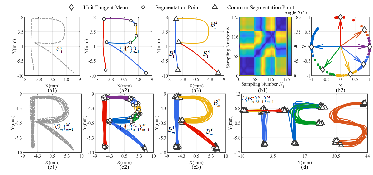 为了增强对特定技能学习的泛化能力且减少过拟合,通常需要多个专家演示作为输入。团队发现单位切向量,是分割和聚类中动作原语的一种理想评判标准。于是如图2所示,团队设计了基于修改K-Means聚类算法与动态时间规整的方法以实现轨迹的无监督分割。