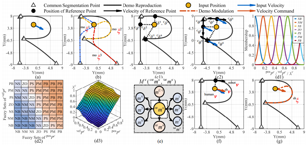 图4 基于UTFMP的意图识别和共享控制。(a)描述了以人类输入速度和机器人当前位置为输入信息的调制;(b)表示以不同的分割子轨迹调制得到的轨迹;(c)表示基于位置与速度的概率模型输出图;(d1)(d2)(d3)分别包含模糊融合隶属函数、模糊规则、模糊融合输出;(e)为马尔可夫状态转移函数图;(f)为经过共享仲裁得到的最终输出速度;(g)基于最终输出速度的轨迹调制。