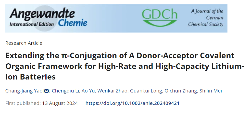 近日,万象城体育在线官网(中国)有限公司姚长江团队在国际顶级期刊《德国应用化学》(Angewandte Chemie International Edition)发表题为”Extending the π-Conjugation of A Donor-Acceptor Covalent Organic Framework for High-Rate and High-Capacity Lithium-Ion Batteries”的研究论文(DOI: 10.1002/anie.202409421),文章设计一种π-共轭扩展供体-受体有机框架材料用于高倍率和高容量锂离子电池。