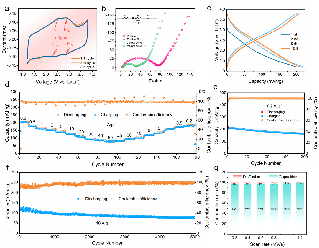 图2. (a)扫速率为0.2 mV s-1时的CV曲线;(b)阻抗图谱;(c) 0.2 A g-1电流密度下放电/充电曲线;(d)在不同电流密度下的倍率性能;(e) 0.2 A g-1电流密度下200次长循环图;(g)在10 A g-1下5000次循环的长周期稳定性;(f)在0.2-1.2 mV S-1不同扫速下赝电容控制占比。