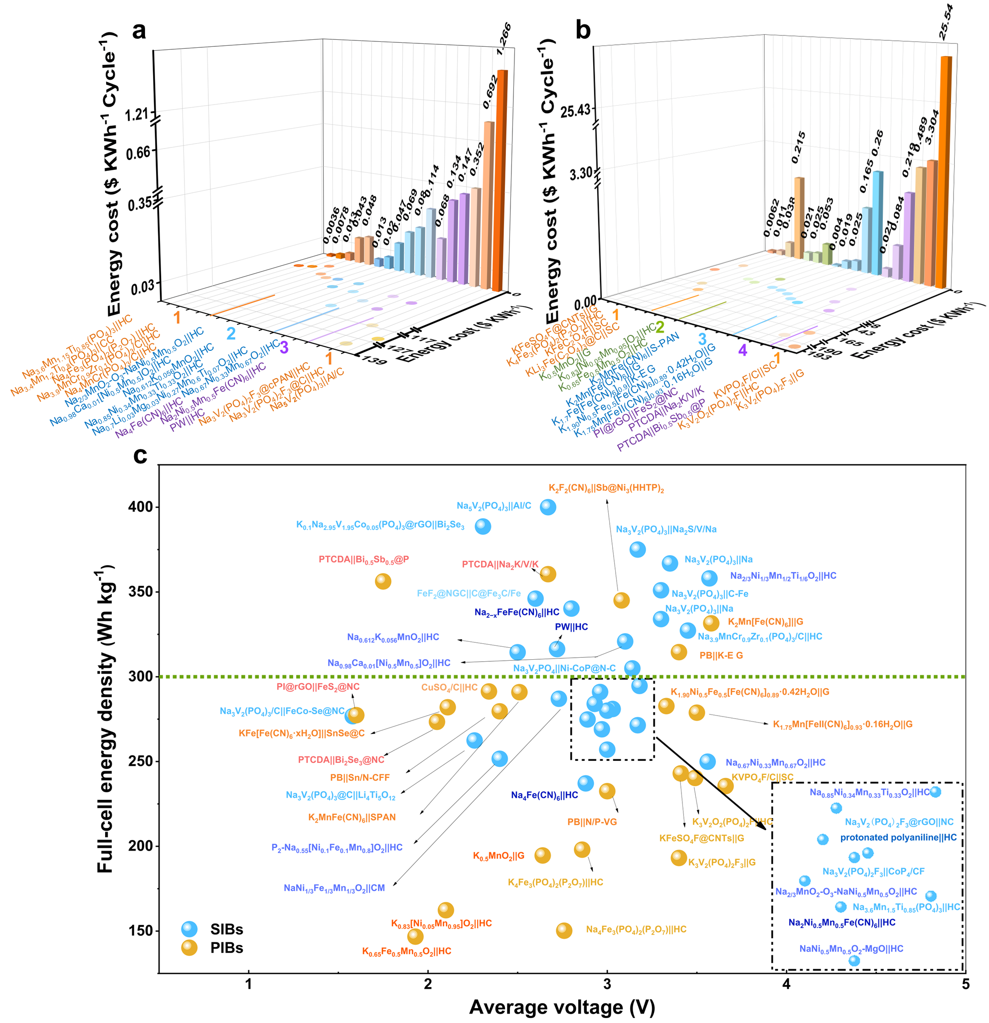 评估新兴技术的一个重要标准是其经济可行性,以能量为基准的成本分析被视为确定这些技术可持续性的有效工具。锂资源的稀缺和大幅增加的需求将显著提高锂离子电池(LIBs)的价格,外加其低安全性,最终限制了LIBs的商业可行性,使其难以负担大规模的工业应用;另外,目前LIBs的能量密度正接近其饱和极限。相比之下,钠/钾金属成本低,其电池体系可使用廉价的集流体。钠离子电池(SIBs)表现了更好的热稳定性和低温性能、更宽的温度适应范围。钾离子电池(PIBs)在热失控时产生的热量要比LIBs少得多,具有更高的安全性。SIBs和PIBs的低成本优势为其在大规模储能应用中开辟了道路。本综述引入了成本效益($ kWh-1·cycle-1)这一重要参数,通过总结近年来的研究进展,基于正极材料的分类,评估并对比了各种钠离子、钾离子和锂离子全电池体系的成本效益,从该角度出发,给出了SIBs/PIBs在某些特定场景中取代商业化LIBs所需达到的能量密度;并进一步对比分析了SIBs和PIBs的电化学行为,其差异表明SIBs是目前大规模储能应用的首要选择;令人鼓舞的是,更高的电池电压、可实现的K+嵌入石墨负极的过程,特别是在高电流密度下高效的充放电过程,良好的循环稳定性,赋予PIBs极大的可能性,在未来应用于大规模储能中。
