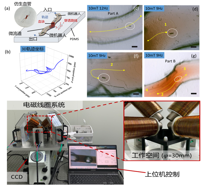 “微磁智清”团队由机电学院王化平教授指导,20级本科生王茂霖担任队长,队员包括郭斯予、高志峤、吴天睿、芦梦四名同学。项目面向当前血栓治疗行业痛点,基于磁驱动和微机器人作业原理,实现了仿生微血管狭窄封闭环境下的磁驱微机器人的药物投递、血栓清理等任务,有望在未来为血栓患者提供个性化、人性化、精准化的医疗服务。