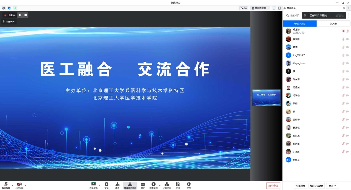 12月2日,由北京理工大学兵器科学与技术学科特区和北京理工大学医学技术学院联合主办的“医工融合,交流合作”学术交流活动在线上举办。6名专家学者围绕医学与工科融合的技术领域,对各自研究方向作了报告。